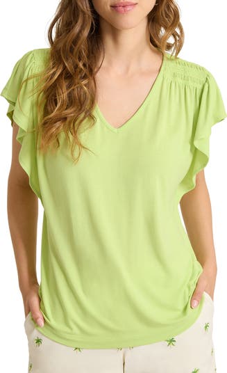 A smocked yoke accents a lightweight and stretchy T-shirt fashioned with an appealing V-neck and fluttery sleeves.