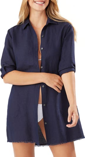 This lightweight boyfriend shirt is the perfect piece to throw on over your swimsuit for some stylish sun cover at the beach. A fringed hemline and gathered waist provide additional flirty flair.