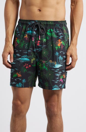 Take a dip in these timeless swim trunks topped by an elastic drawstring waist that's comfortable on land and in the water.