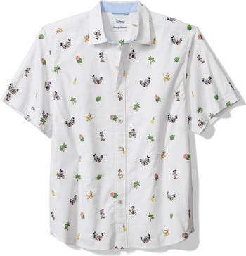 Get ready for your next vacation to Disney World in this short-sleeve button-up shirt featuring an allover tropical Mickey-and-Minnie Mouse print.