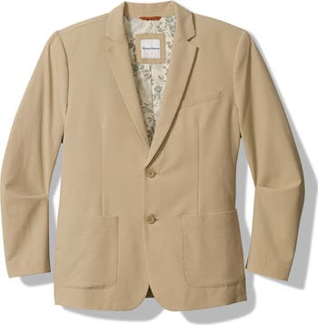 A boldly patterned satin lining and fresh stretch-cotton seersucker lend a resort-ready aesthetic to a breezy sport coat framed by sharp notched lapels.