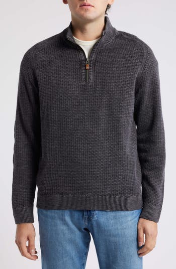 A geo-textured cotton knit that's washed and faded to old-favorite perfection makes an easy go-to of a sweater that's finished with a short front zipper and old-school patches on the elbows.