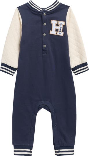 Varsity vibes meet cozy comfort in this crawl-approved cotton‑blend coverall with tipped trim and an initial chest patch.