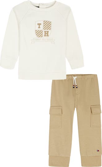 Baby will look cute and stay cozy in this cotton-forward set that pairs a fleece sweatshirt with regal embroidery and cargo pants.