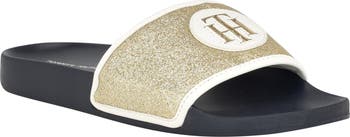 A classic slide sandal is made with a dust of glitter to add glam to your look. Sizing: True to size.