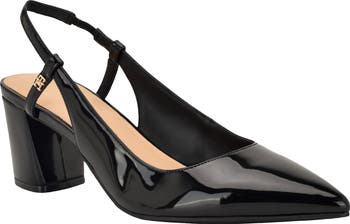 A pointy toe and block heel balance a sleek patent pump fashioned with an elastic slingback strap for easy entry.
