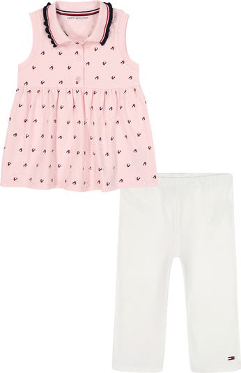 Stretch-enhanced cotton ensures baby stays comfy and cozy in this Johnny collar top patterned with signature Tommy hearts and a ruffle trim collar; solid leggings complete this look.