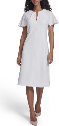 A dainty keyhole with polished hardware and flutter sleeves frame this Empire-waist midi dress cut from soft scuba crepe in a graceful A-line silhouette.
