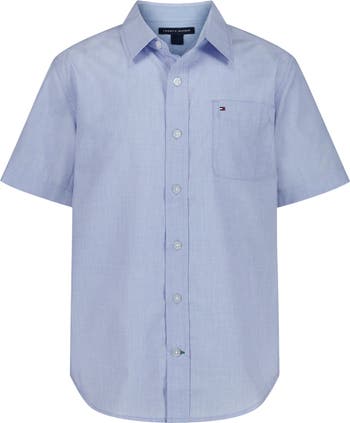They'll look sharp in a snap with this short-sleeve button-up shirt cut from crisp cotton-blend fabric and finished with a classic chest patch pocket.