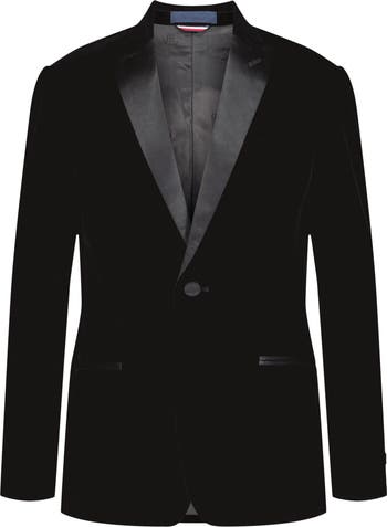 Shiny satin fabric defines the peaked lapels, covered buttons and pocket trim on a staple sport coat that has your kiddo looking dapper on special occasions.