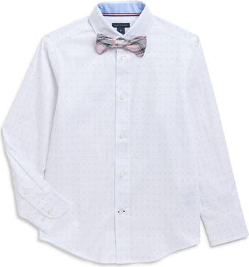 Get them event-ready in no time with this sharp set featuring a geometric dot-patterned dress shirt and a plaid bow tie.