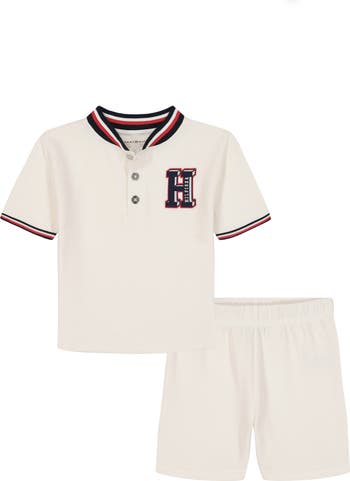 Striped trim and a large logo done in the brand's classic Americana color palette defines the henley in this set complete with matching shorts.