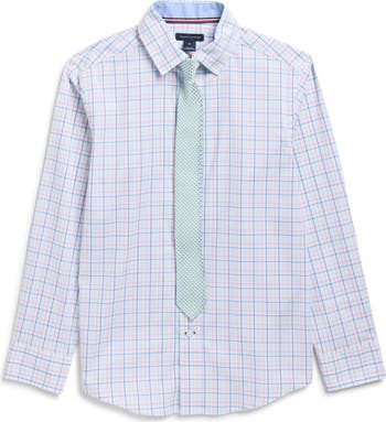 Get them event-ready in no time with this sharp set featuring a check-patterned dress shirt and a grid bow tie.
