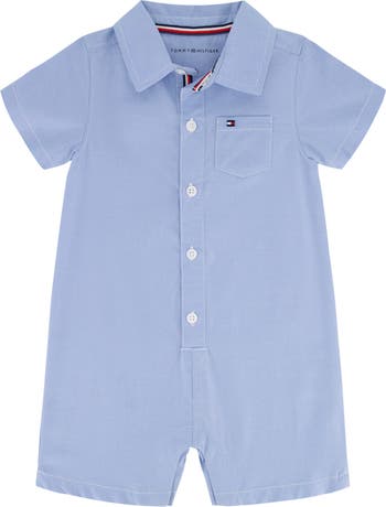 Keep your little one feeling comfy and looking sharp in this breathable cotton-chambray romper featuring a preppy collar and back logo print.