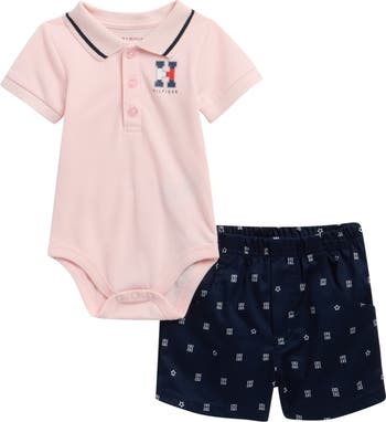 Baby will have a complete polished and preppy look with this polo bodysuit and monogram-print shorts set.