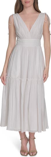 Gathered tie shoulders and a wide Empire waist frame a sleeveless dress cut from metallic-striped chiffon for whimsical style.