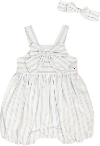 Baby will be ready for warm-weather days in this striped romper cut from a breathable cotton blend and comes complete with a bow headband.