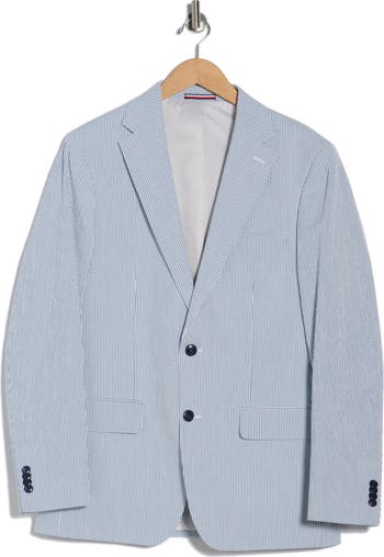 Bring tailored polish to your warm-weather ensembles with this single-breasted sport coat cut from fresh, breathable stretch-cotton seersucker etched with slender stripes.