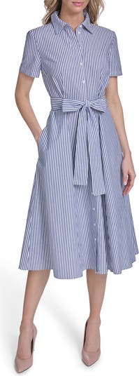 Breeze through your day in this pretty striped cotton-poplin shirtdress framed by a removable tie belt and handy side pockets.