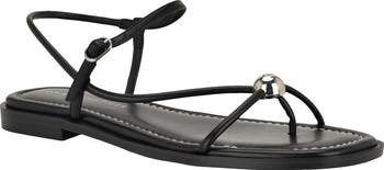 A polished, branded bauble sits perfectly within the strappy upper of a sandal that makes a perfect companion on warm-weather days.