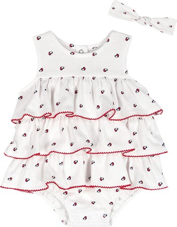 The brand's iconic Americana hearts lend sweet style and heritage charm to a bubbly skirted bodysuit complete with a matching headband.