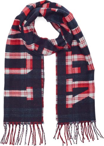 Iconic style meets cold-weather comfort in this fringe-trimmed, yarn-dyed plaid scarf featuring the brand's hallmark colors and bold blocky logos.