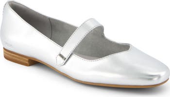 A mary jane strap adds distinctive style to this metallic flat set on a cushioned OrthoLite® Eco LT-Hybrid insole.