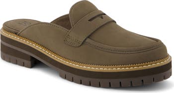 A classic penny keeper and loafer-inspired topline lend trend-savvy appeal to a leather mule lifted by a chunky heel and durable lug sole.