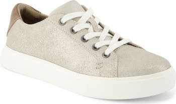 A lace-up design and low-profile silhouette lend street-savvy appeal to a shimmery leather sneaker grounded by a well-cushioned footbed and sporty cupsole.