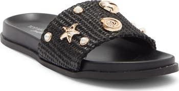 Gleaming charms highlight the raffia strap of this easy-wear slide sandal that brings beachy style to sunny days.