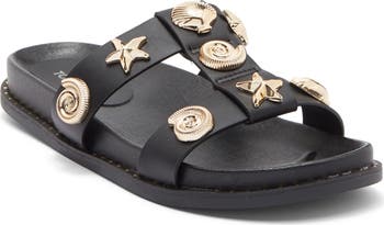 Beachy charms gleam from this strappy slide sandal grounded by a contoured footbed and flat sole.