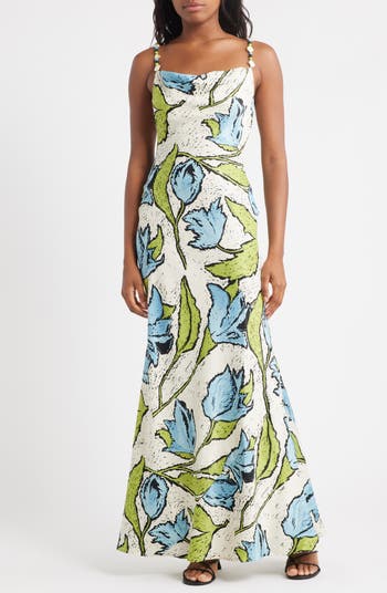 An artistic floral pattern blossoms on a cowl-neck dress that's destined to be a summery favorite.