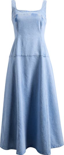Light-wash denim lends a casual feel to this fit-and-flare midi dress sporting a square neckline, seam details and a dropped waist.