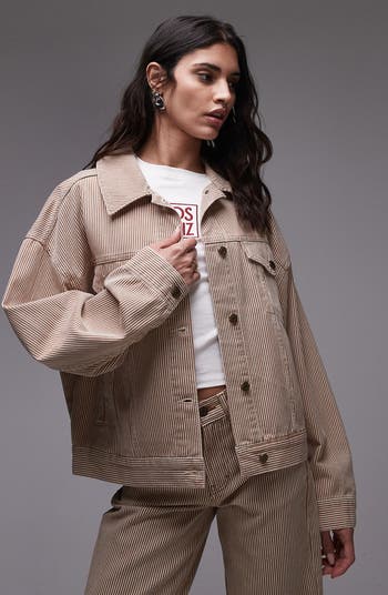 A roomy fit and balloon sleeves switches up the look of a classic trucker jacket cut from sturdy all-cotton denim marked in smart stripes.