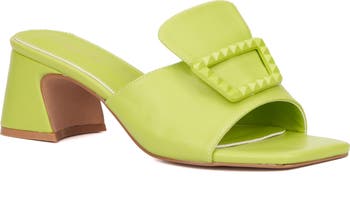 A pyramid-studded buckle and exaggerated tongue stand out on this block-heel slide sandal that's perfect for sunny days.