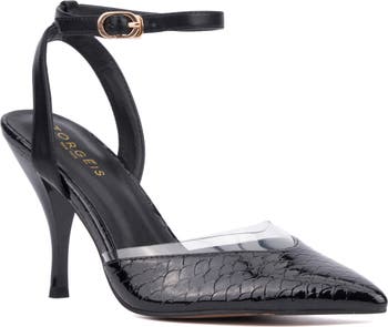 Elevate any outfit with this scale-embossed ankle-strap sandal fashioned with a pointy toe and tapered stiletto heel.