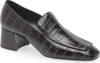 Croc-embossed leather furthers the textural allure of an Italian-made loafer with a minimalist profile featuring a rounded toe and stacked block heel. A supersoft suede-lined heel counter provides additional comfort.