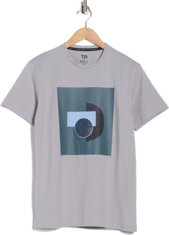 Abstract graphics and dimensional details define a crewneck T-shirt cut from stretch-enhanced cotton for easygoing comfort.