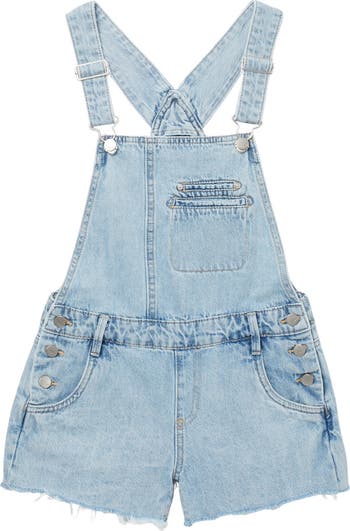 A raw hem adds distressed style to this cotton blend pair of denim shortalls your girl will love.