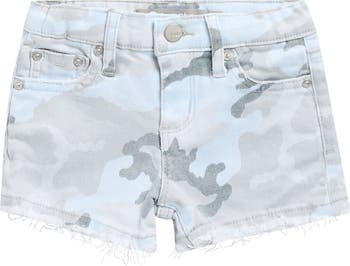 Perfect your kiddo's warm-weather wardrobe with these cutoff denim shots covered with a bold camo print.