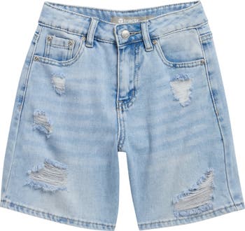 Give your kid casually cool style with these comfy cotton-blend denim Bermuda shorts done in a faded wash with threadbare holes.