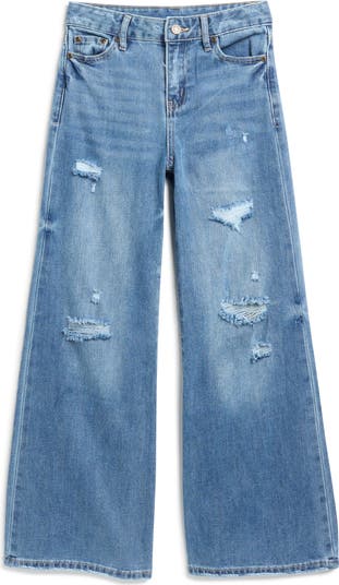 Give your kid casually cool style with these faded, distressed jeans cut in a bold wide-leg silhouette.
