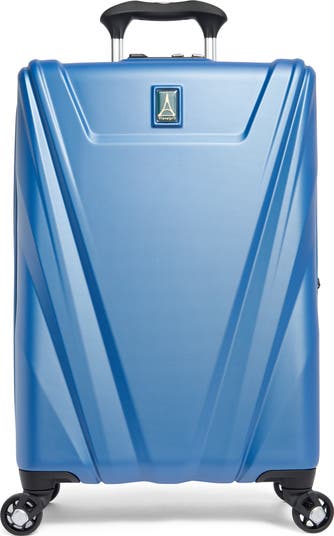 Exterior features: Water-resistant polycarbonate material with a textured surface ensures lightweight durability and protection. A telescoping handle maximizes comfort and control for users of different heights. Four double-wheel spinners glide effortlessly to navigate through busy airports.
