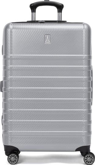 Exterior features: Water-resistant ABS and flexible polycarbonate material with a textured surface ensures lightweight durability and protection. A telescoping handle maximizes comfort and control for users of different heights. Four double-wheel spinners glide effortlessly to navigate through busy airports.