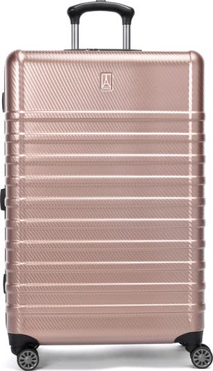 Exterior features: Water-resistant ABS material with a textured surface ensures lightweight durability and protection. A telescoping handle maximizes comfort and control for users of different heights. Four double-wheel spinners glide effortlessly to navigate through busy airports.