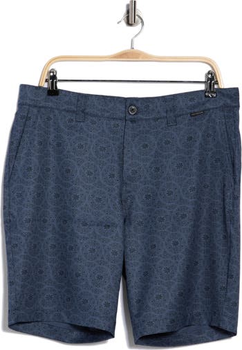 A geometric tile print brings cool retro style to these flat-front chino shorts cut from stretchy performance fabric.