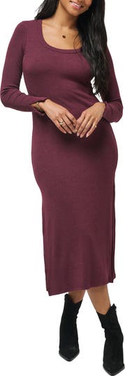 Easy side slits and a scoop neck enhance the casual comfort of a long-sleeve dress textured with fine allover ribbing for a figure-clinging fit.