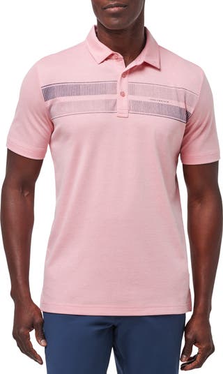 Patterned stripes race across the chest of a wrinkle-resistant polo made with soft, breathable cotton to keep you comfortable day and night.