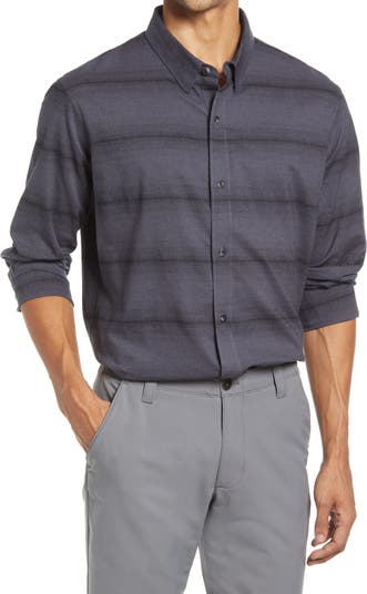 Sweet stripes touch up a versatile shirt cut from stretchy cotton for a flexible fit.
