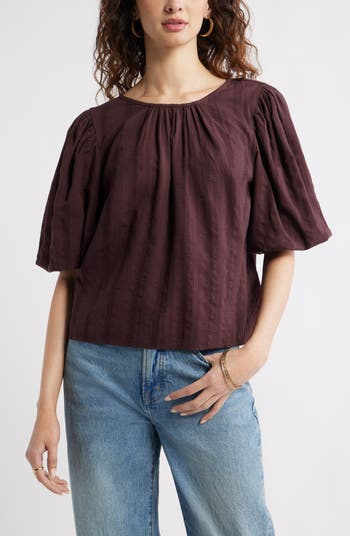 Tonal stripes bring understated texture to this fresh cotton-dobby top sweetened with puffy sleeves and soft shirring along the neckline and shoulders.